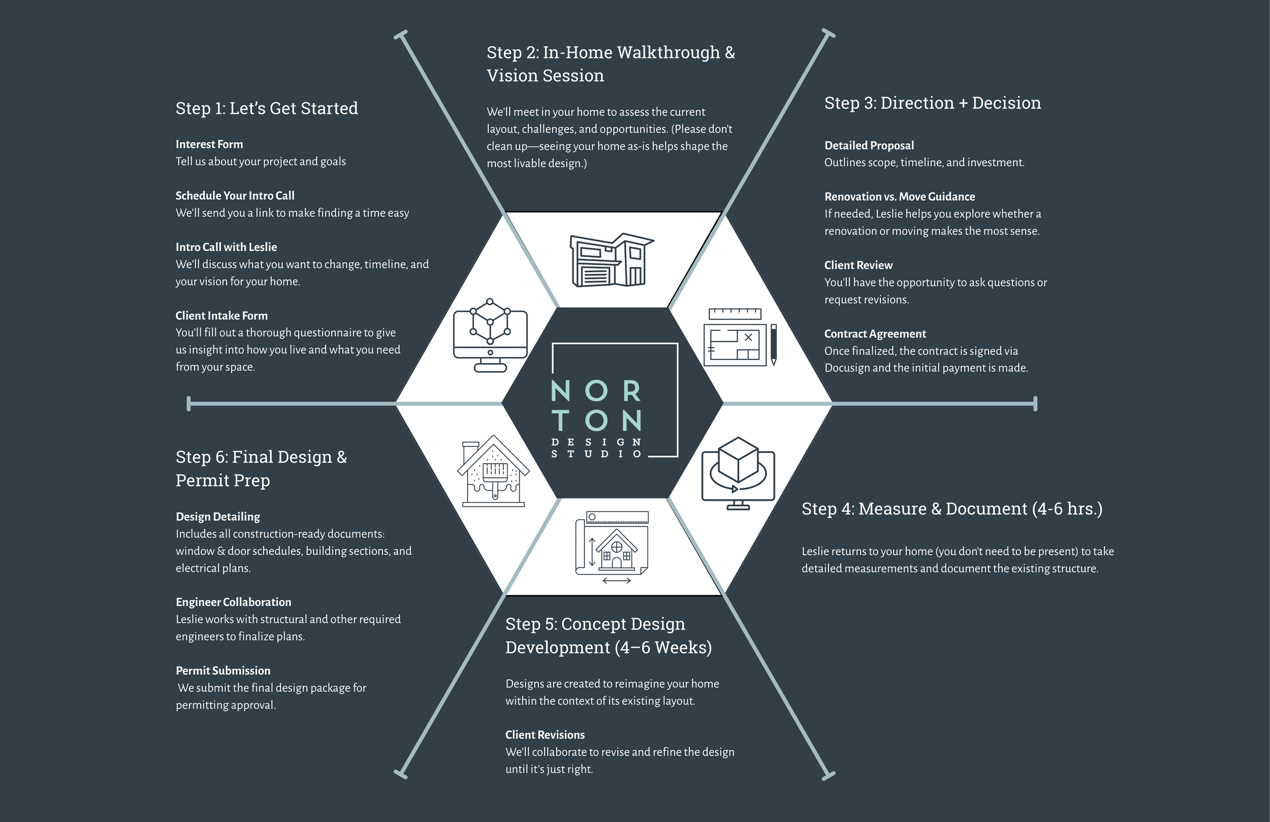 *Often, clients will opt to collect preliminary estimates from Contractors on construction costs. This step is completed by the client and not by Norton Design. We’re happy to provide Contractor References upon request.
